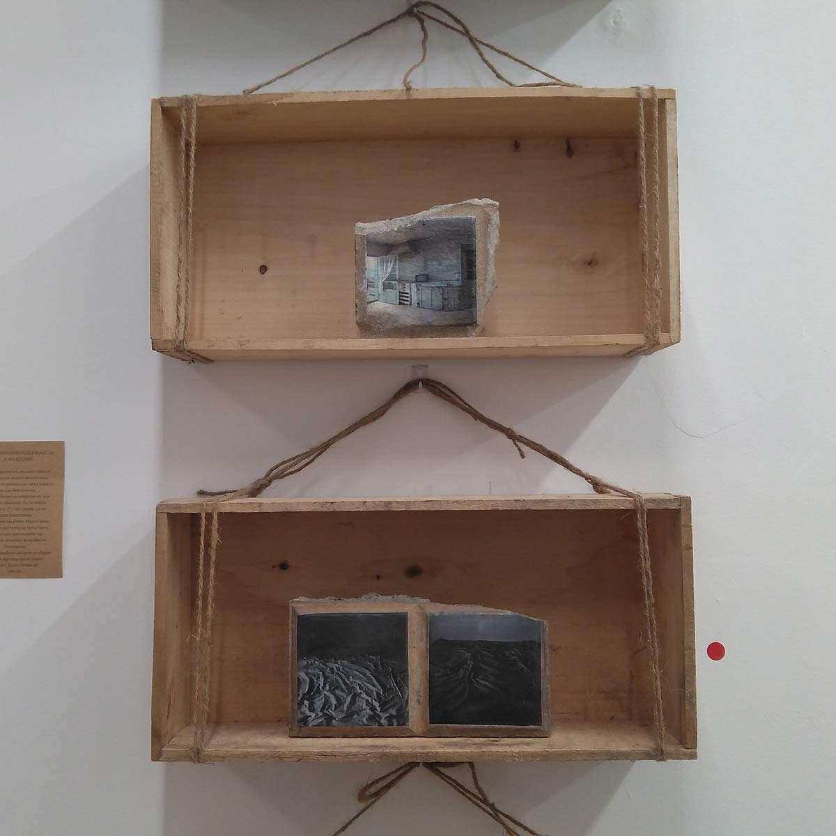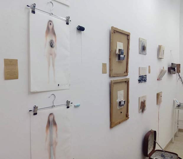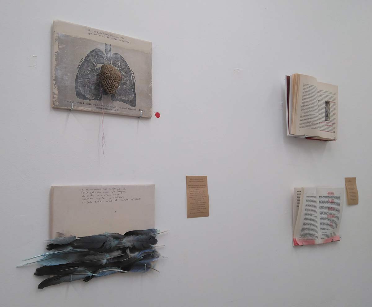 Hay transferencias fotográficas, adoquines que se encontró en una acera, baldosas alteradas con elementos naturales, libros cosidos con hilos que van uniendo palabras, collages de fotografías, cajas de cerillas intervenidas con imágenes coloreadas, zapatos con elementos naturales y hasta arena de playa y botes con lágrimas.
