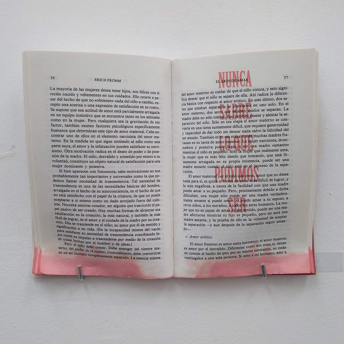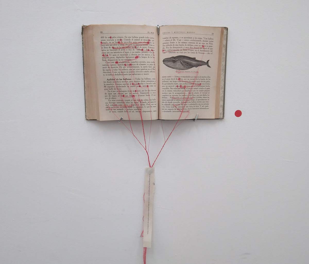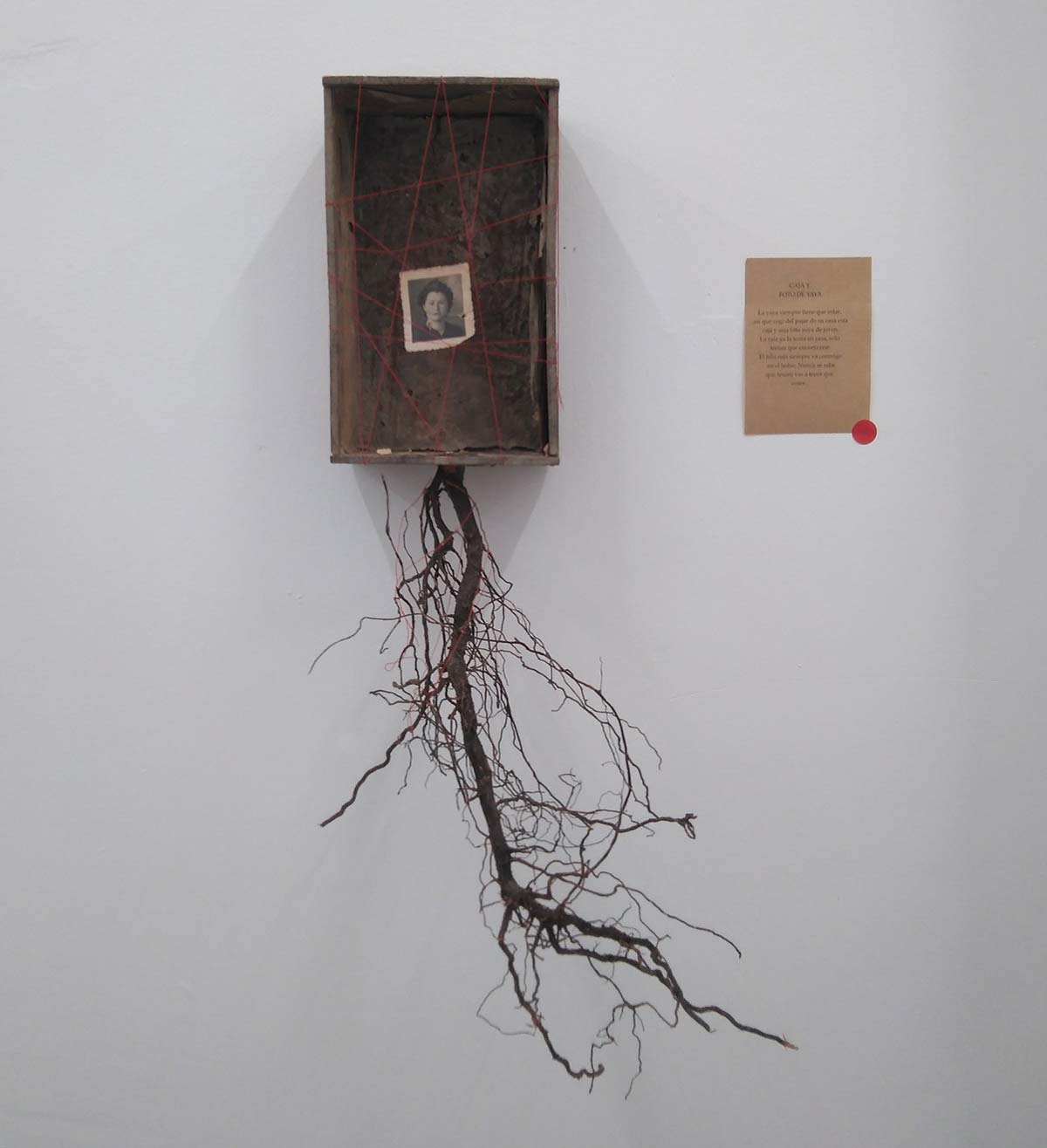 Hay transferencias fotográficas, adoquines que se encontró en una acera, baldosas alteradas con elementos naturales, libros cosidos con hilos que van uniendo palabras, collages de fotografías, cajas de cerillas intervenidas con imágenes coloreadas, zapatos con elementos naturales y hasta arena de playa y botes con lágrimas.