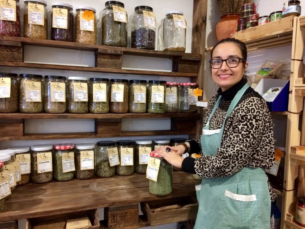 La tienda está decorada con palés reutilizados, detalles rústicos y objetos familiares que transportan a tiempos pasados. Ordenadas por estanterías, encontramos una amplia selección de especias y condimentos para cocina. Nos destaca Mayte que uno de los productos más novedosos de esta sección es el achiote, utilizado como colorante en Latinoamérica, que incluyó recientemente a petición de una clienta mexicana que no podía encontrarlo en Zaragoza.