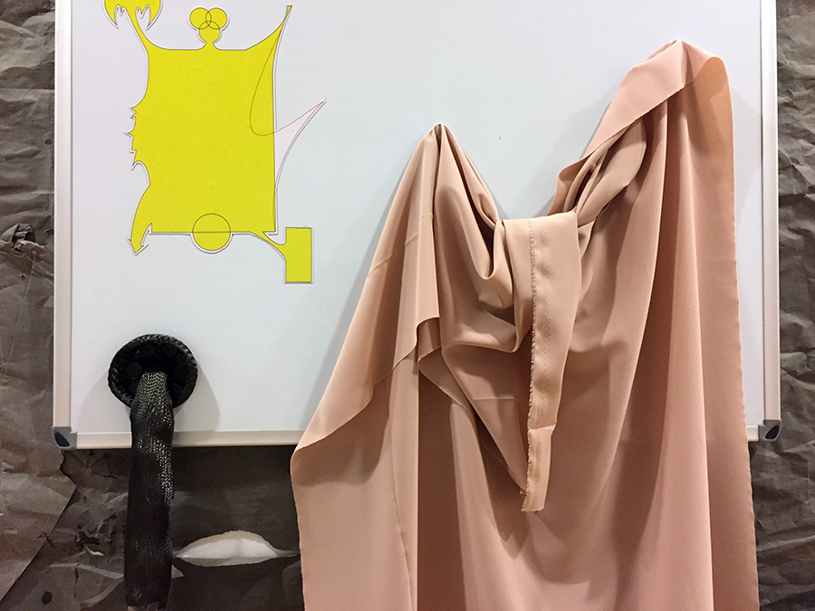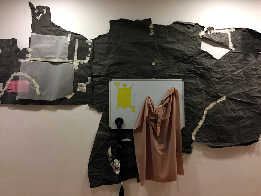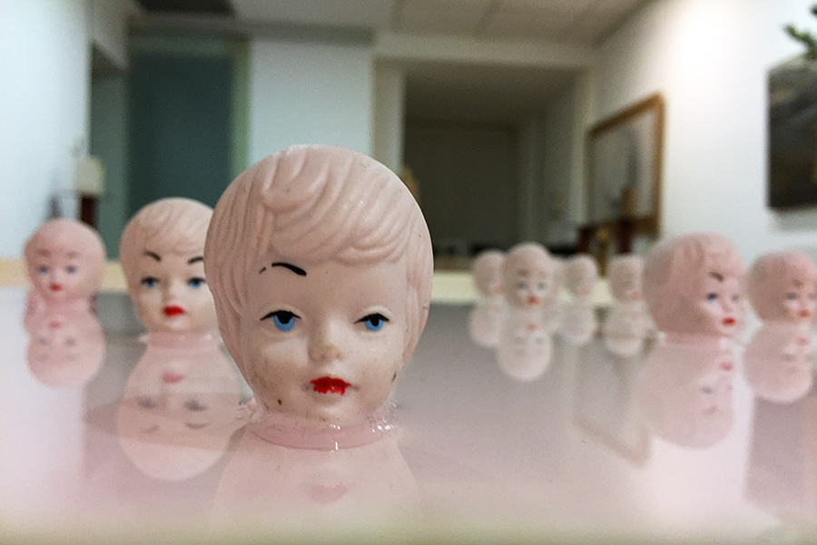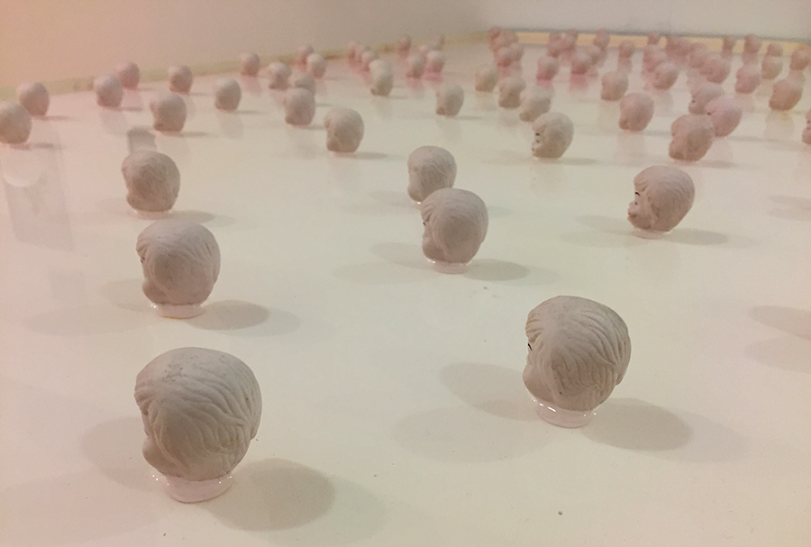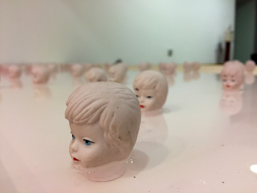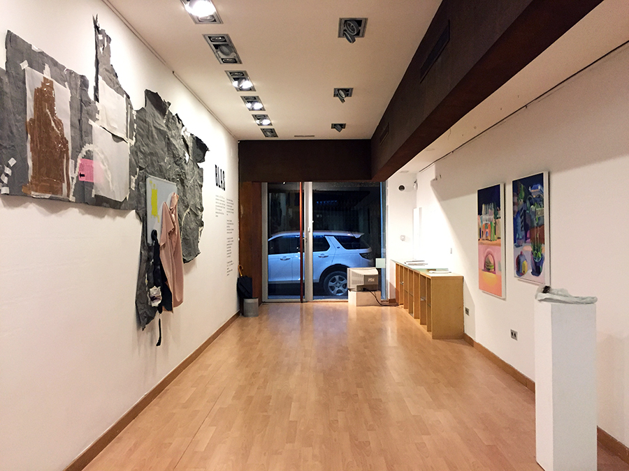 En Finestra presenta una cuidada selección de obras entre las que llaman la atención una instalación mural realizada en una técnica mixta que combina papel, pizarra, textil y fotografía desarrollada bajo una clara estética povera. Además, al fondo de la galería se nos presenta una exquisita pieza compuesta por cabezas de muñecos dispuestas sobre una base rosa que rápidamente llama nuestra atención. Además, podemos ver otras obras de pinturas abstractas, fotografías y escultura.