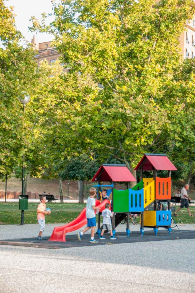 Pero no siempre fue así, aquí antes no había ni un árbol. Es un parque ganado al asfalto. Cuando a mediados de los 80 la Industrial Química se trasladó fuera del barrio de La Almozara, quedó un enorme terreno lleno de escombros y basuras, justo entre la plaza de Europa y el palacio de la Aljafería. Había hasta dudas sobre si los árboles crecerían bien, pero hoy lucen frondosos y robustos.