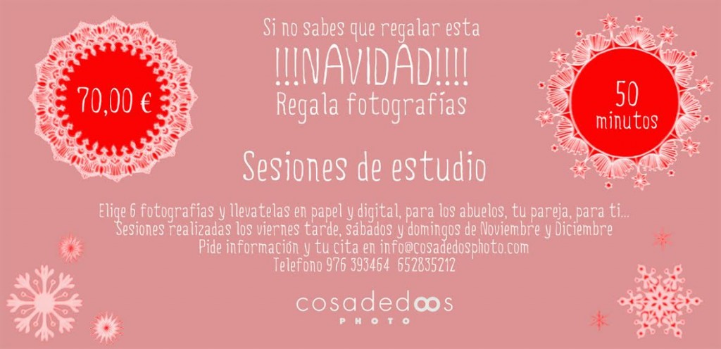 Es una sesión de estudio corta de 50 minutos donde el cliente se llevará en papel 6 fotografías editadas y el DVD con las fotos a resolución web. Es una oportunidad de regalar fotografía a nuestros seres queridos, esas fotos que nos reclaman los padres.