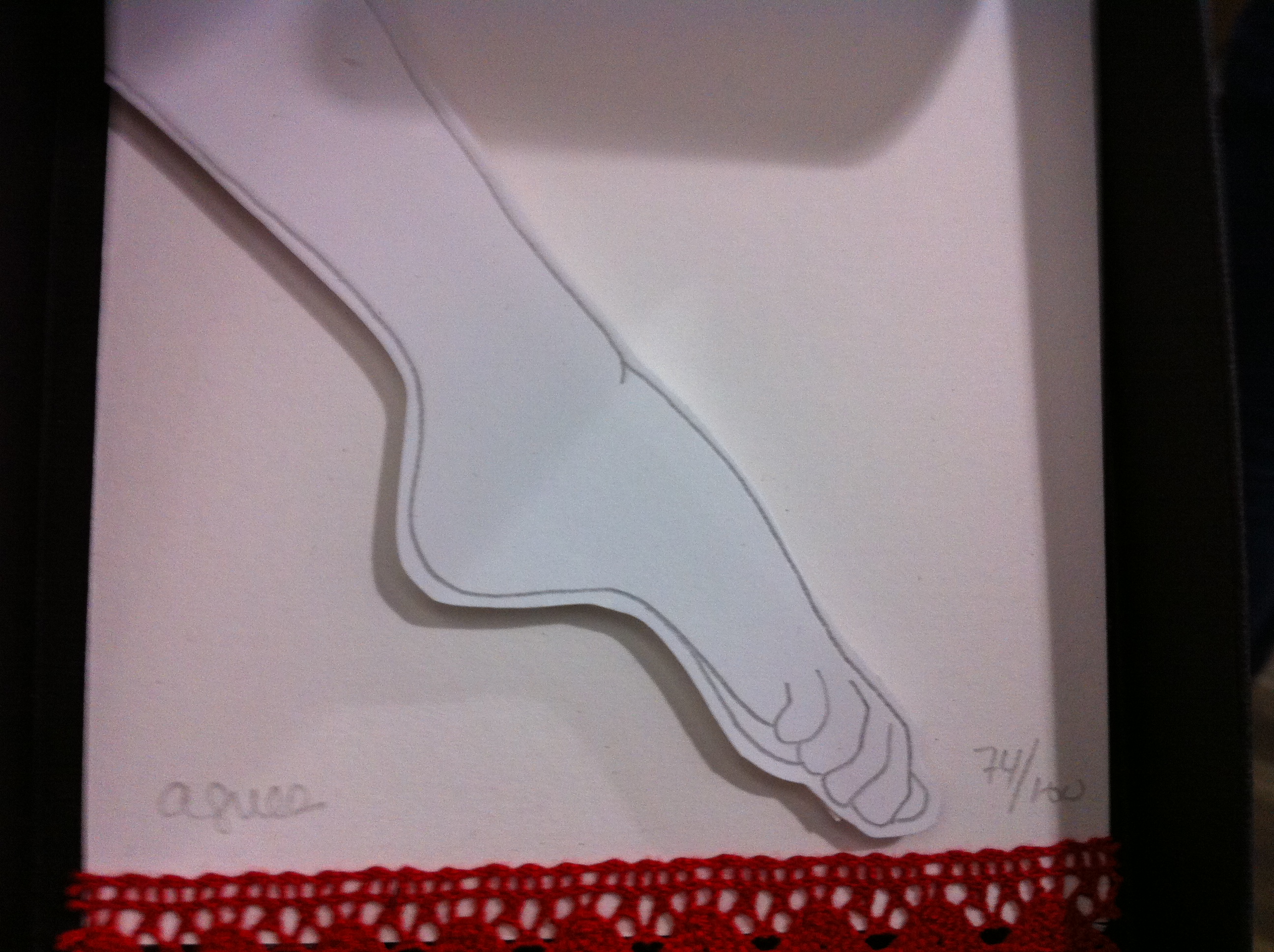 Totalmente. Desde un principio pensé en crear unas ilustraciones que partieran de los pies. Puede parecer redundante, ya sabes: zapatillas–pies, pero tiempo atrás ya hice una exposición con temática parecida, con fotos de Jota y una carpeta con textos e ilustraciones mías. Les enseñé aquel material a Fran y a Bea y les gustó, así que decidimos plantear la exposición desde esa temática ya que además, la consigna era sorprender con el uso de materiales diferentes así como en el concepto.