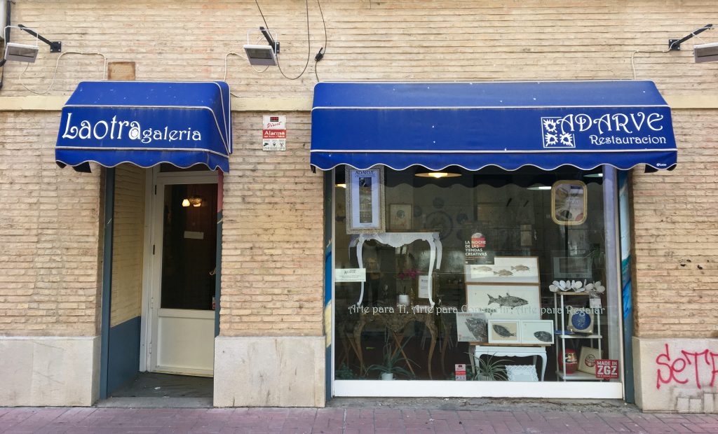 Por una parte, no tiene un rótulo o letrero en la fachada que le identifique, y por otra, los nombres que hay en los toldos pertenecen a “La Otra Galería”, una galería de arte que estaba en ese local antes de Fabiola y ya no está, y a “Adarve Restauración” la empresa de restauración con la que comparte el local.