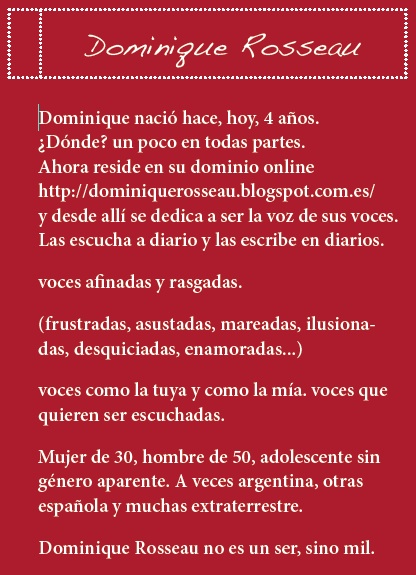 Con todo lo que está investigando, más lo que vive y observa en primera persona, intuye que algún día todo esto saldrá de su cerebro en forma de libro literario con tono muy divertido, al igual que le ha brotado de su imparable imaginación este Una y mil veces voces, un curiosísimo compendio de diarios extraídos de su blog, DiariaMente Dominique, que sorprende por su estilo fresco, directo, ágil y diferente para ser una autora novel. Para ella fue una sorpresa que la editorial Sibirana se lo propusiera, y se dispuso a descartar relatos y a ordenar los escogidos por tres capítulos: Silencios, susurros, gritos. Las voces que recoge son de lo más variopinto y original, lo cual permite que la mayoría nos sintamos identificados con algunas, sino con varias. Paz cuenta que todos estos diarios están inspirados en las vidas que ha ido conociendo en sus viajes y a su alrededor, pues observa y luego se evade totalmente de la realidad para escribir y describir lo experimentado desde su subjetivo y peculiar modo de contarlo. Esperamos con ansias esas nuevas voces sobre la violencia de género que de momento estudia académicamente.