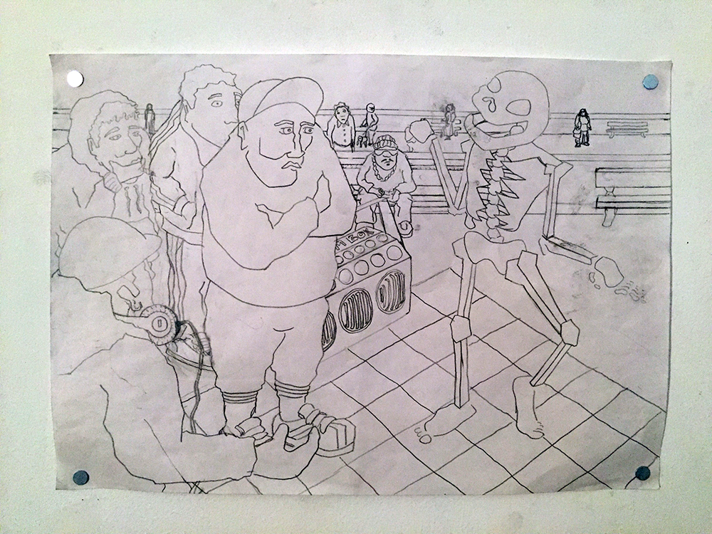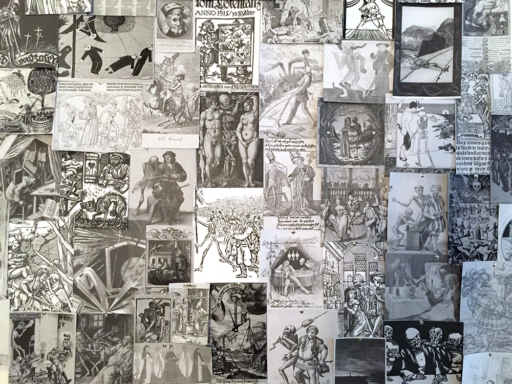 Con este punto de partida, Sergio Aragón realiza una profunda investigación sobre el género con especial atención a los grabados realizados por Hans Holbein a partir de los que trabaja sus dibujos y grabados recuperando, actualizando y poniendo en contexto está asentada tradición de la literatura y las artes visuales, particularmente recurrente enla historia del grabado. Lo que expone en Antonia Puyó nos ofrece una amplia visión tanto del género como del proceso creativo que ha seguido el artista. Podemos ver el material histórico y gráfico sobre el que ha investigado y que le sirven de inspiración (en un recorrido que va desde grabados del siglo XV hasta manifestaciones recientes del género), los dibujos preparatorios para los grabados, las planchas matrices de los linóleos y las nueve linografías finales que forman la colección.