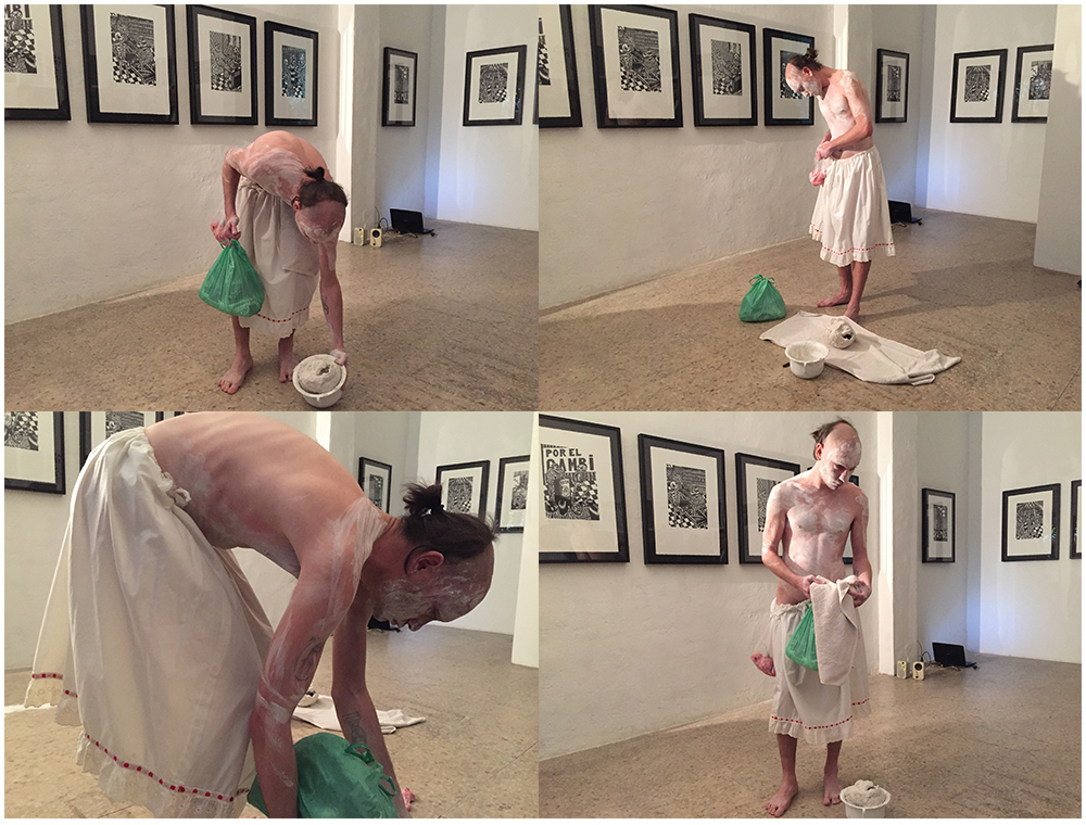 Samuel Hereza parte de la reflexión sobre el ejercicio individual del cuerpo político y el enfrentamiento a la colectividad de los discursos sociales. En su performance realiza la presentación de la muerte simbolizada en una especie de calavera a la que da de comer trozos de carne cruda. El artista usa su cuerpo también como objeto artístico sobre el que juega e interviene, pintándolo de blanco e incluso automutilándose con un bisturí. Una pieza dura, cruda para representar una danza macabra de una forma muy personal y visceral.