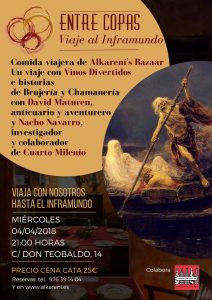 Pues bien, la siguiente cena temática, que se celebrará el miércoles día 4 de abril a las 21h, será un Viaje al Inframundo, para profundizar en temas de Brujería y Chamanería de nuevo de la mano de Nacho Navarro y David Maturén, tal fue el exitazo de la primera vez. Para nutrirnos durante el viaje, una cata con vinos de Vinos Divertidos que maridarán con la gastronomía exótica del Alkareni’s Bazaar. No olvides reservar en el 976391404.