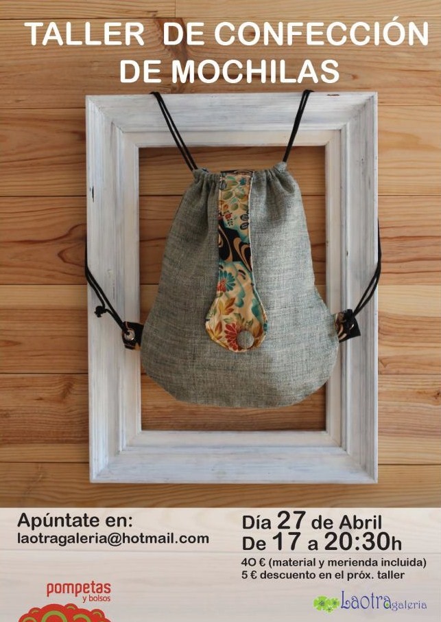 Taller de confección de mochilas: En colaboración con Pompetas y Bolsos, el día 27 de abril a las 17 horas. Por 40 euros, que incluyen material y merienda y además 5 euros de descuento para el próximo taller.