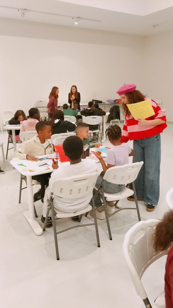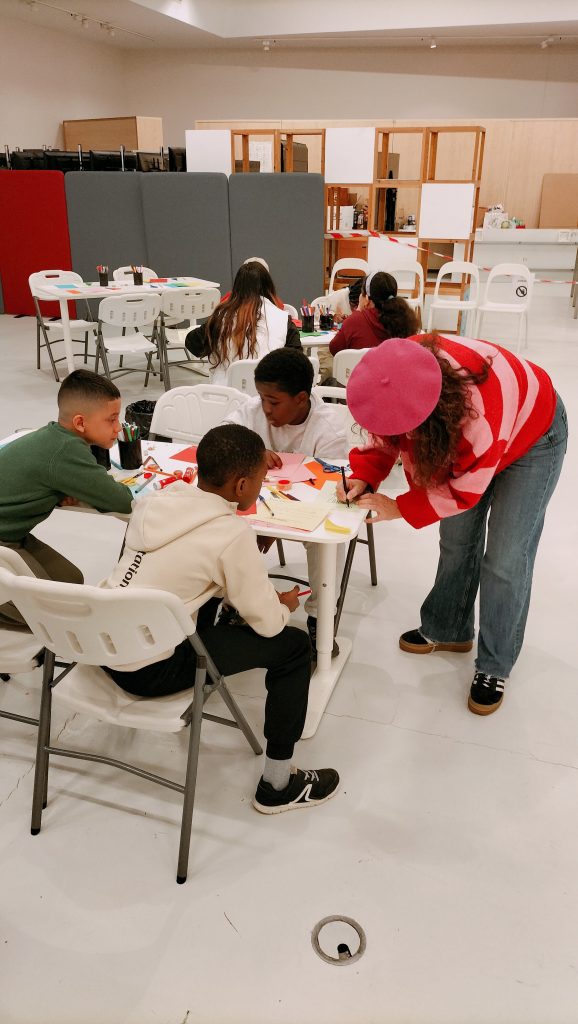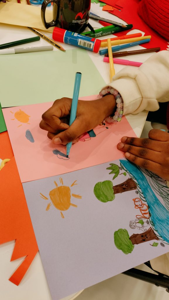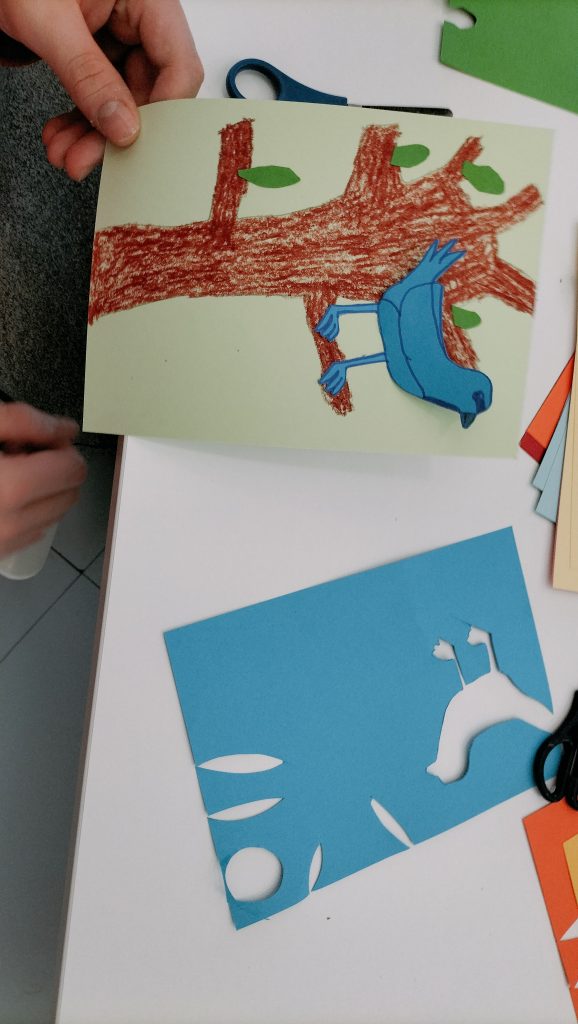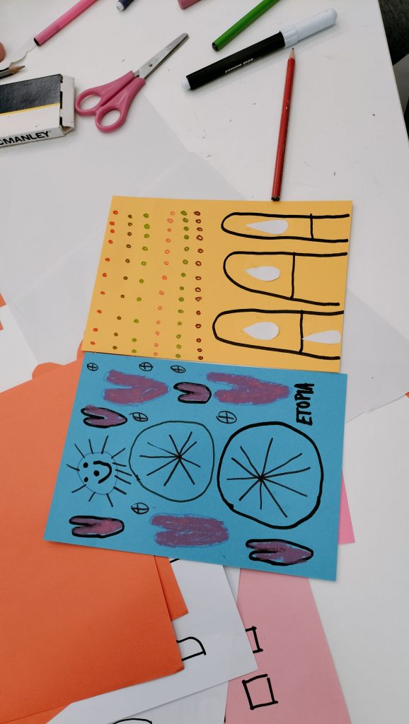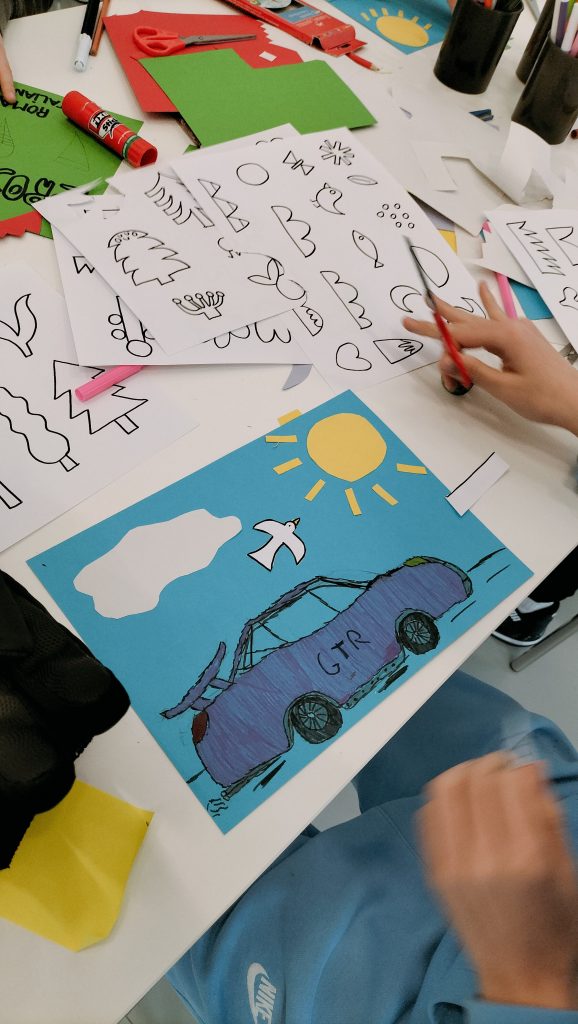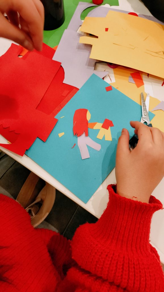 A lo largo de la hora que dura el taller los alumnos exploran y juegan a través de distintas técnicas sencillas de ilustración, como pueden ser los rotuladores hasta el collage con cartulinas de colores, para llenar las páginas de su pequeño cuaderno plegado convirtiéndolo en una obra original.
