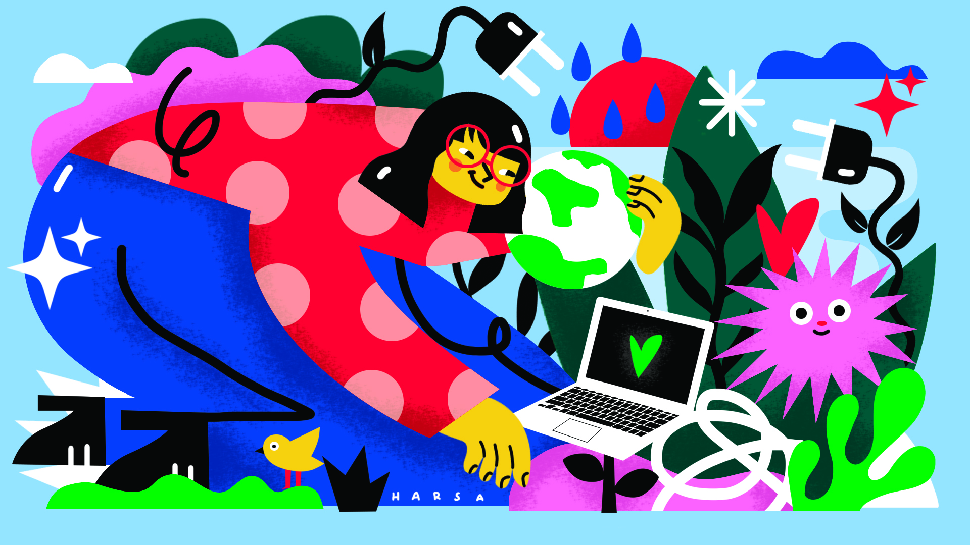 Su obra está muy vinculada a la ilustración contemporánea, y se caracteriza principalmente por el uso de un lenguaje visual vibrante, orgánico y muy alegre. Harsa construye universos donde la belleza, la energía y la sensibilidad conviven, invitando al espectador a sumergirse en narrativas llenas de vida y color.