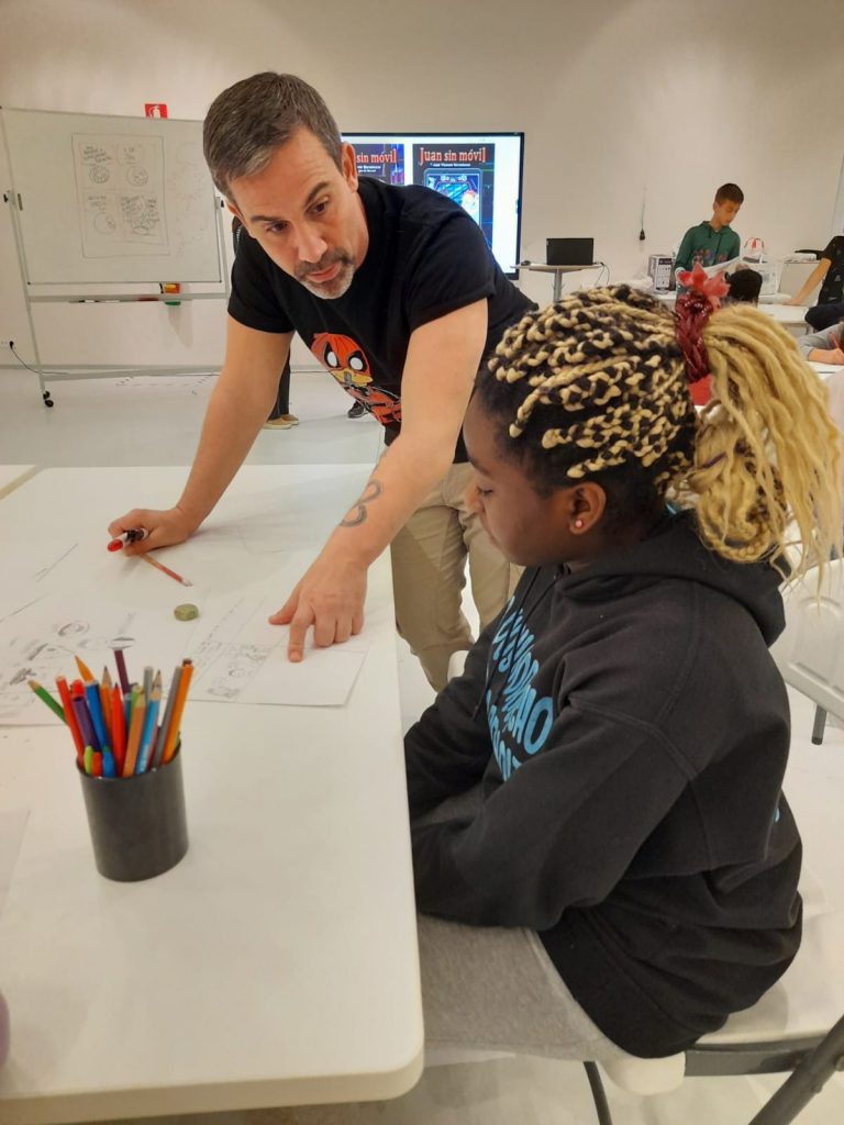 En el taller Bernal enseña a narrar historias visuales, diseñar personajes, estructurar viñetas y utilizar elementos narrativos para captar la atención del lector. Al finalizar el taller crean un cómic corto usando sus propias ideas.