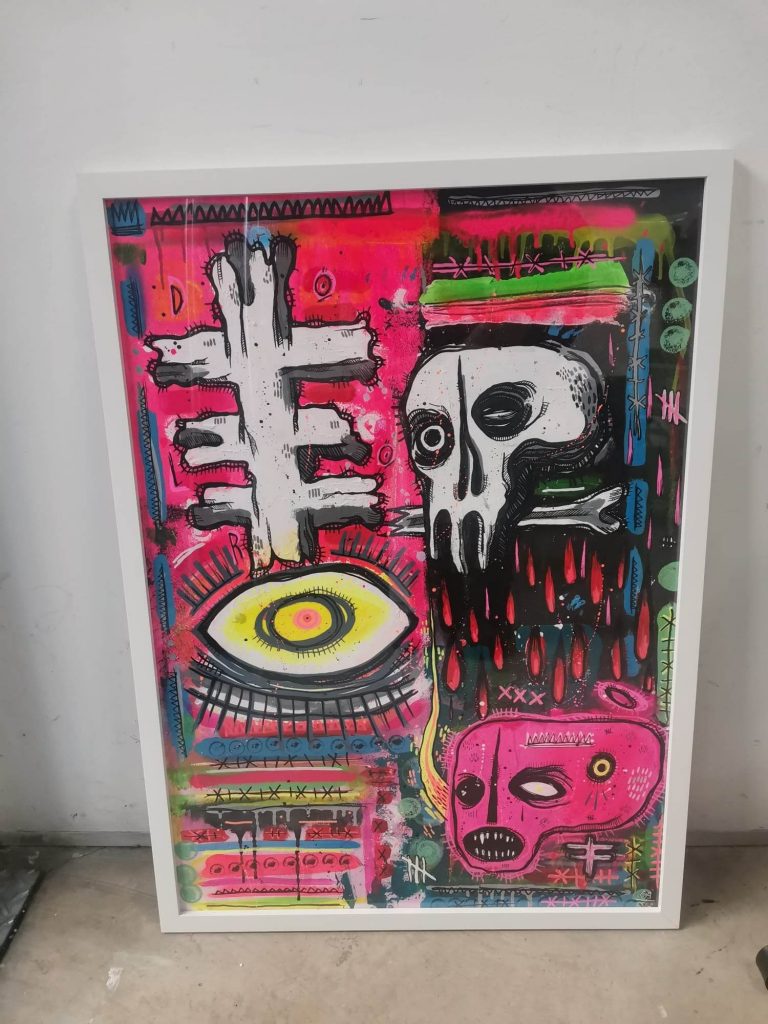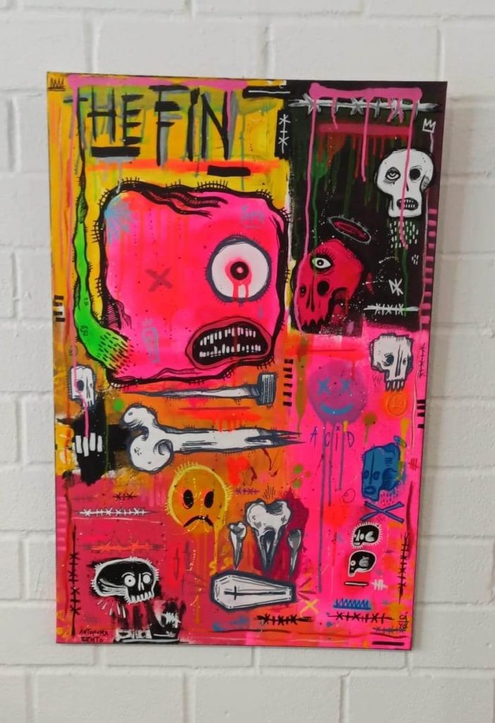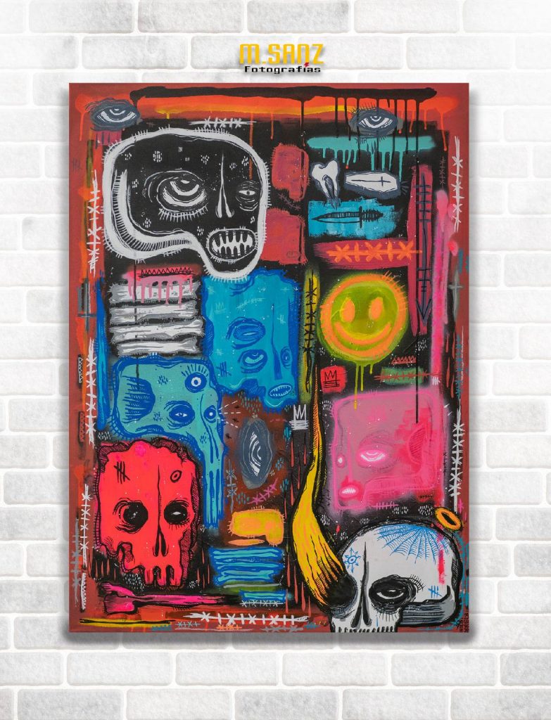En el trabajo de Cayo podemos observar las conexiones creativas que buscamos mostrar en los talleres, en la cantidad de referencias que hay en sus obras. En ellas encontramos símbolos a la cultura mexicana, siempre presentes en su obra con las calaveras; a la música, en concreto la música punk; referencias al cine de terror o la contracultura underground.