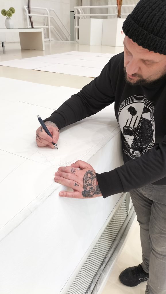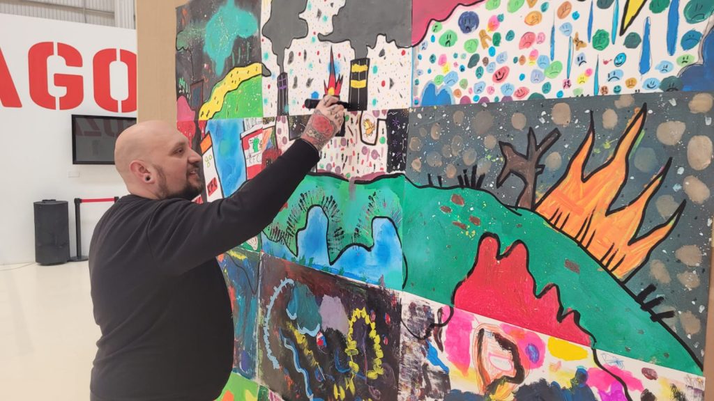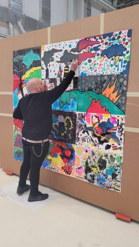 Una vez finalizados los talleres y sobre las láminas ya montadas sobre el muro de exposición, Cayo intervine las láminas de loa alumnos con algún detalle de su cosecha para crear una unidad entre todos los dibujos y así dar como resultado una obra, original y única.