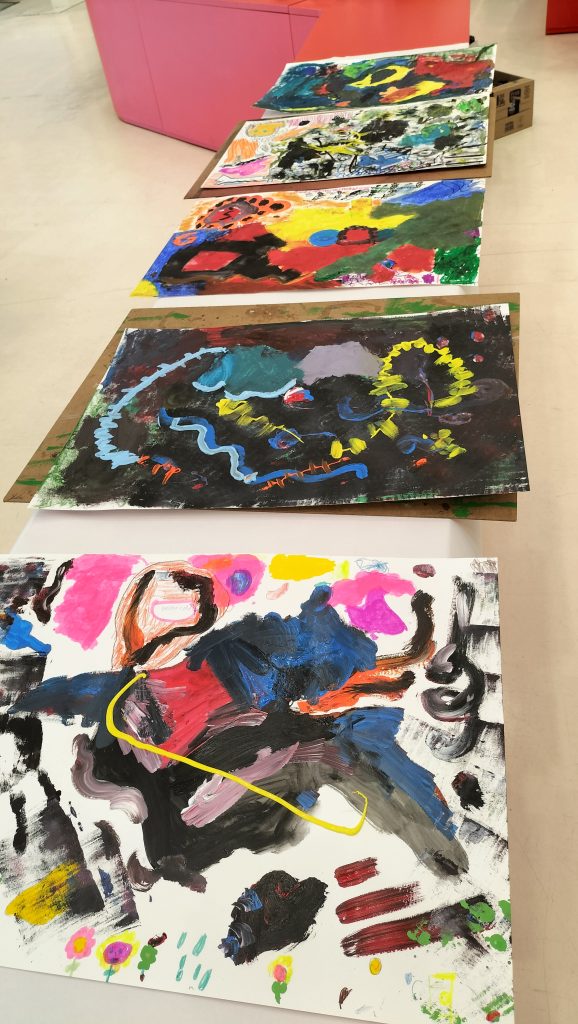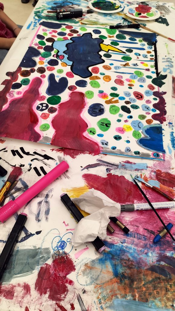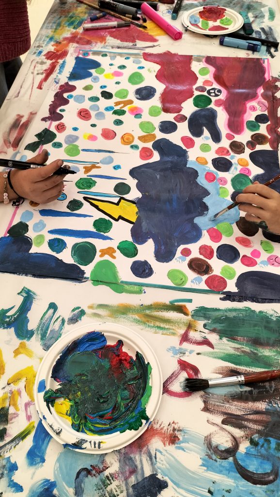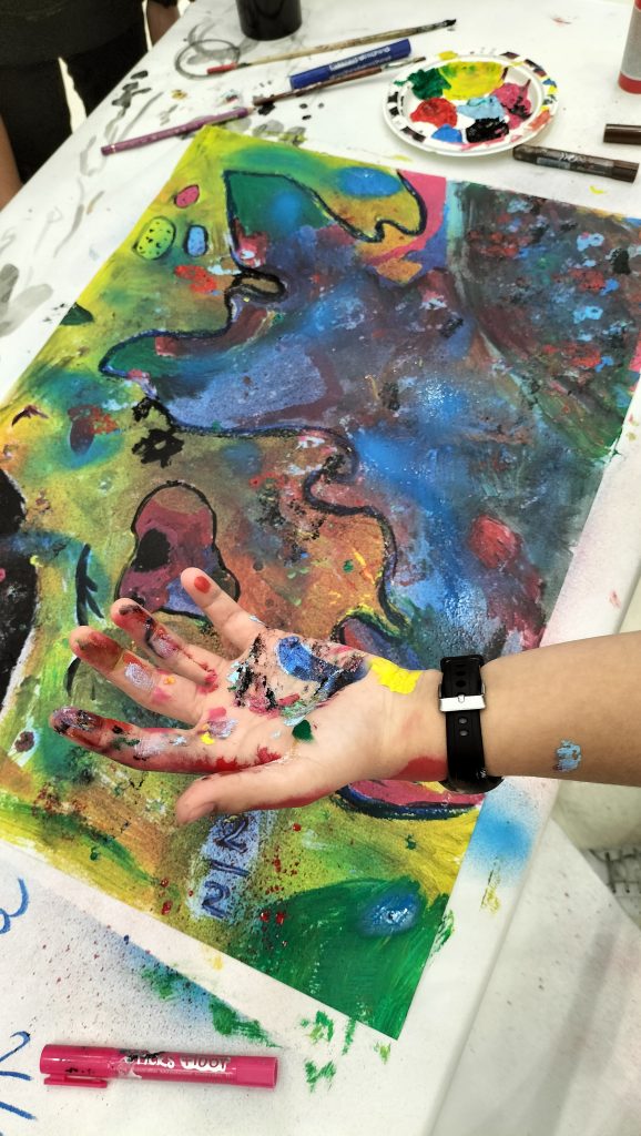 Comenzamos con una breve charla sobre la creatividad y cómo sacarla de nuestro interior. Una vez centrados en nuestro objetivo, se pasó a la realización de un mura. Los alumnos y alumnas se dividieron en grupos de tres y se les proporcionaron laminas en A3 y los materiales necesarios, así como el tema con un escueto punto de partida para comenzar a pintar.