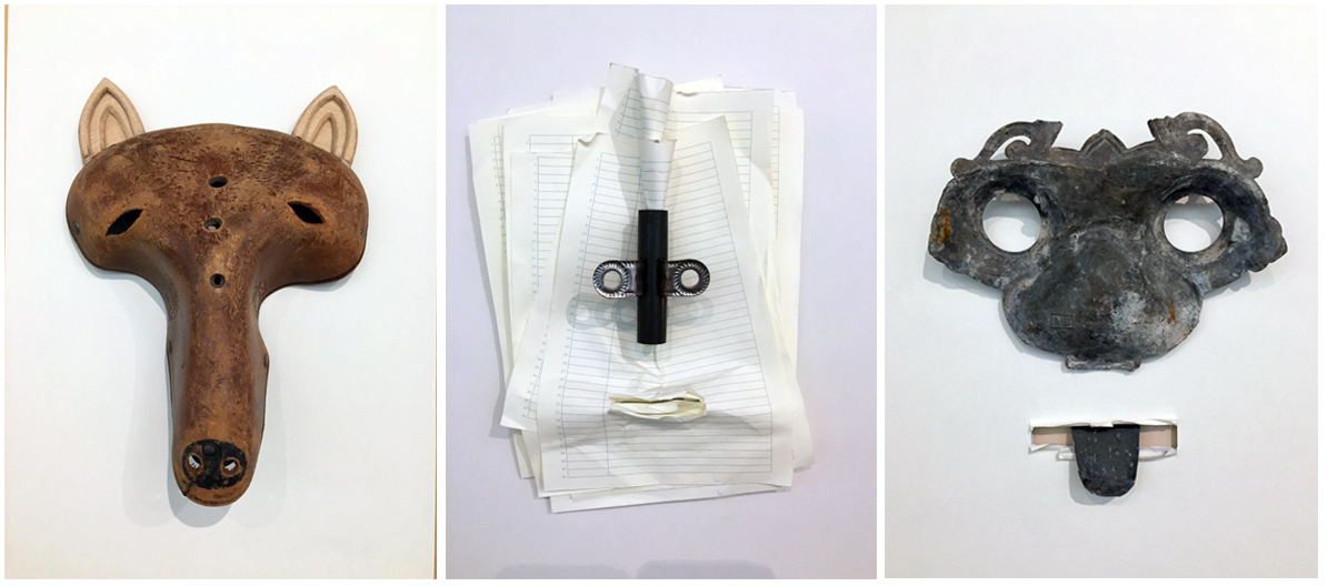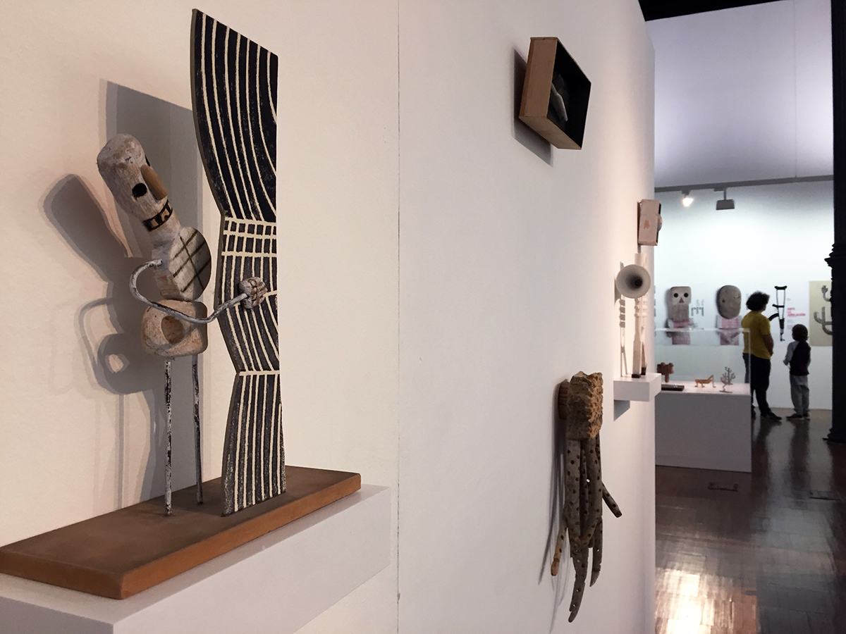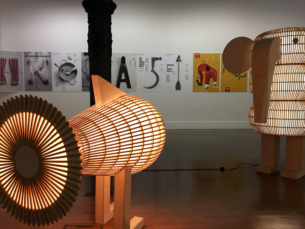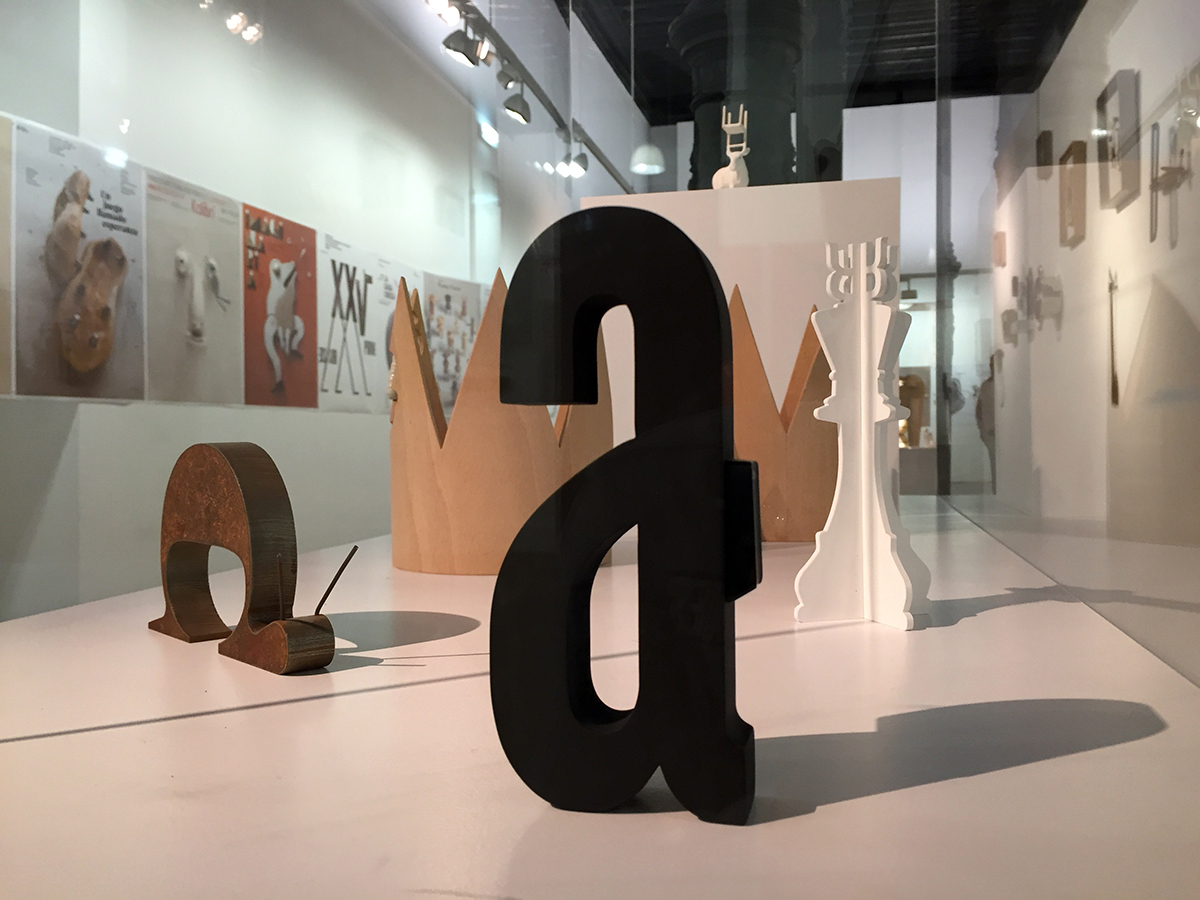 Por eso, en la exposición además de los carteles que están puestos directamente sobre la pared, sin enmarcar, solo sujetos como podríamos encontrarlos en la calle, Isidro nos presenta muchos de los objetos que ha creado para realizar el cartel. Y en ellos es donde vemos la magia de este creador. Sus objetos son pequeñas maravillas creadas con un exquisito gusto por lo artesanal y realizadas con un mimo y un cariño que transciende a la propia obra. Muchas de ellas son piezas de apariencia sencilla pero que, viéndolas en detalle, albergan juegos metafóricos y visuales geniales, nos plantean recursos y mezclas de conceptos, guiños humorísticos y en ocasiones irónicos.