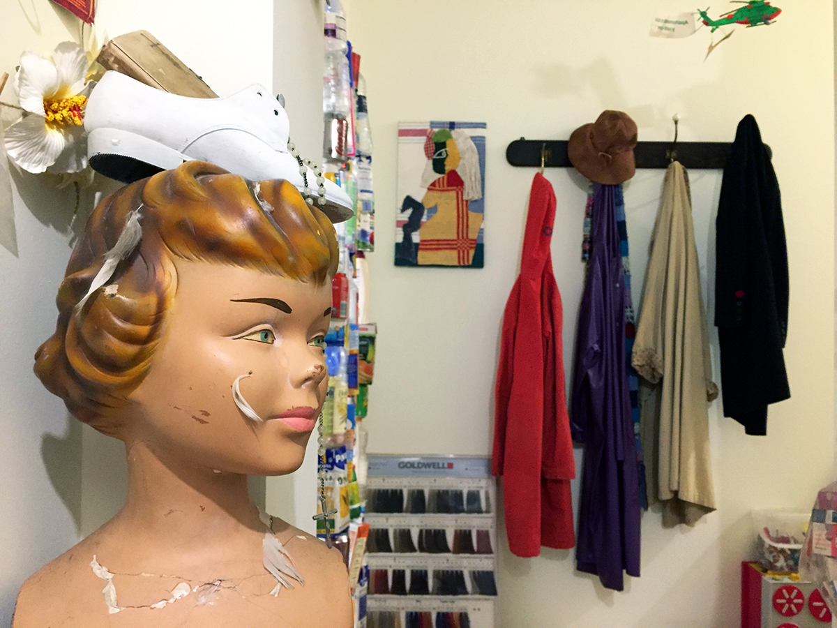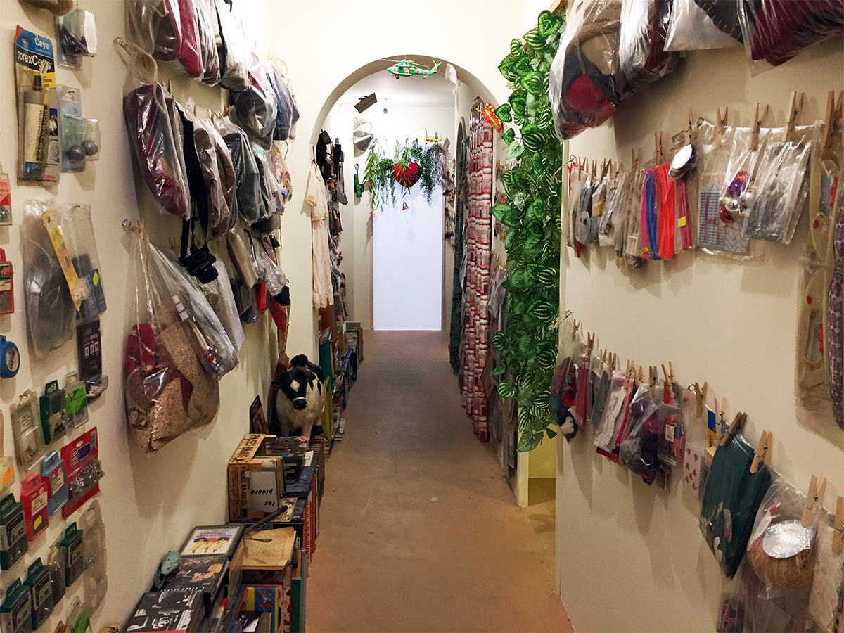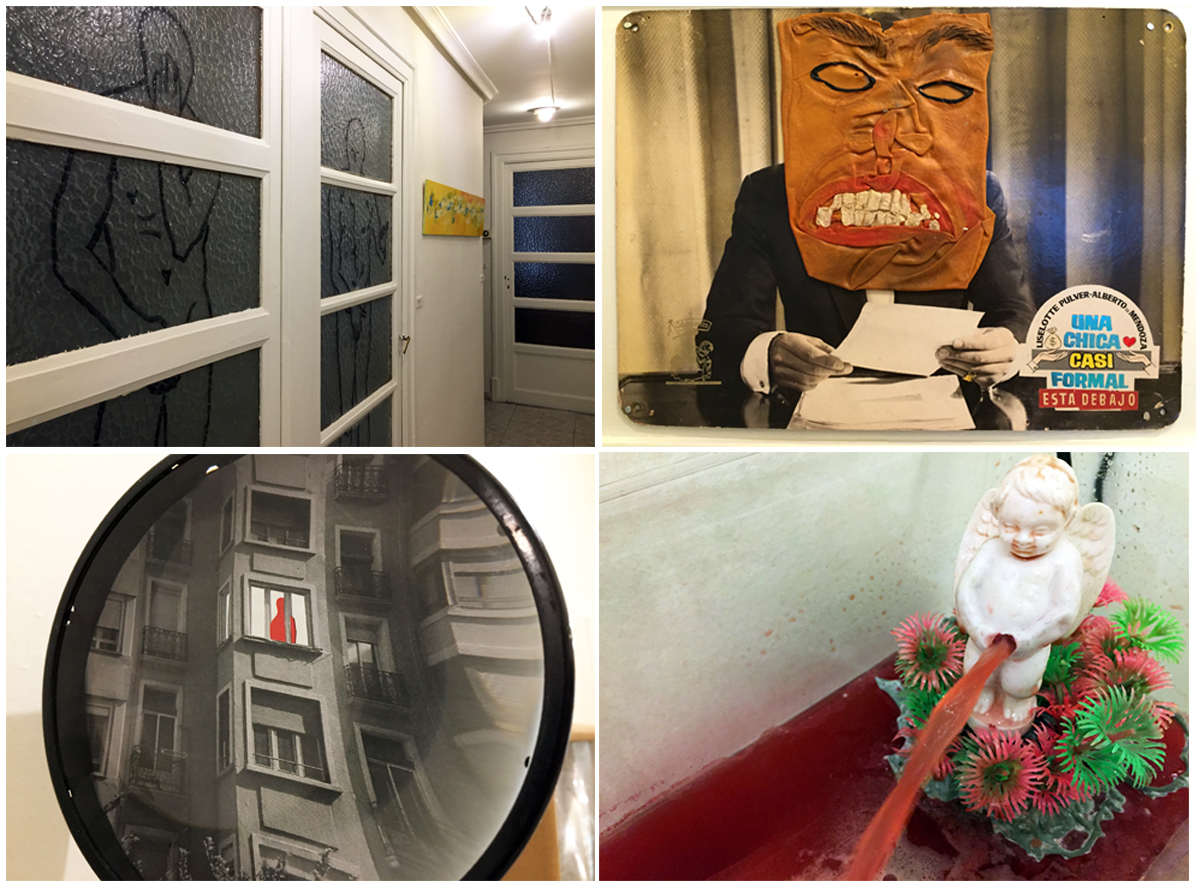 Su pasillo es un lugar muy especial donde encontramos un extenso catálogo de objetos personales, objetos encontrados, objetos creados y objetos poéticos. Es un viaje emocional al surrealismo y al dadá en su sentido más literal. Carteles, juguetes, fotografías, libros, anuncios, manquíes, ropa, cuadros, pendientes y más pendientes y un sinfín de exquisitos delirios en forma de objeto es lo que nos espera allí. Todo su pasillo real ha sido vaciado y trasladado a la exposición, pero entonces… ¿qué ha quedado en su pasillo? Vayamos a su casa a verlo.