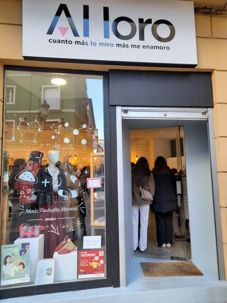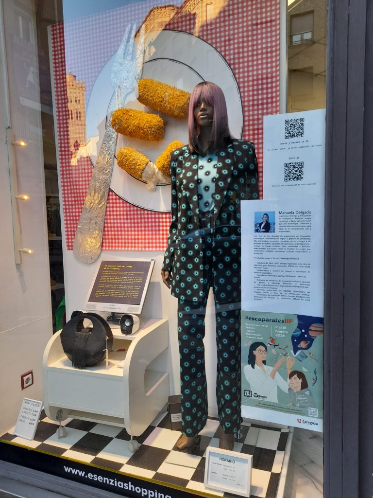 A pocos metros, en ESENZIA, un espacio que mezcla moda y estilo con propuestas culturales, rindió homenaje en su escaparate a la ingeniera Manuela Delgado. Allí se presentó su trayectoria, marcada por la ingeniería industrial y proyectos tecnológicos pioneros, incluyendo su proyecto “El curioso caso del sesgo de la croqueta”, que une creatividad, ciencia y divulgación.