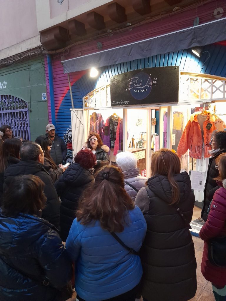 La siguiente parada fue BLACKLIGHT VINTAGE, en la calle San Lorenzo, un espacio de ropa y complementos de segunda mano. En este escaparate pudimos conocer a Lupita Montoya, ingeniera ambiental e investigadora que ha dedicado décadas a estudiar la calidad del aire y la salud en interiores, en especial en espacios como salones de manicura, donde ha analizado cómo los compuestos químicos de productos cosméticos afectan la salud de trabajadores y comunidades expuestas.