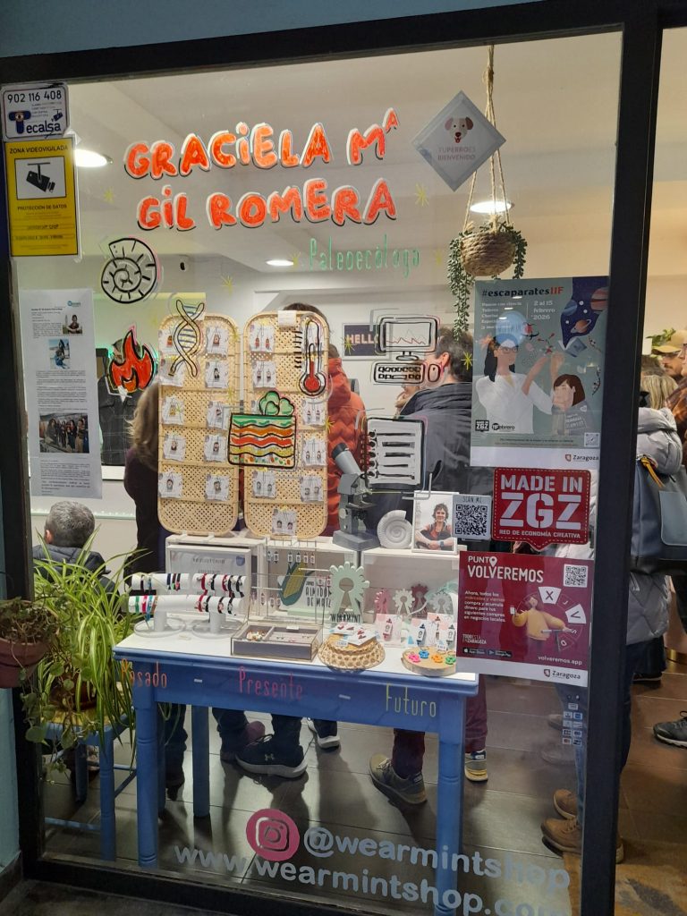 Más adelante, en WEARMINT SHOP, una boutique con complementos de moda de diseño propio, la ruta dio visibilidad a Graciela Gil Romera, una destacada científica e investigadora del Instituto Pirenaico de Ecología del CSIC en Zaragoza. Su escaparate invitó a detenerse y reflexionar sobre el Cambio Global y la dinámica ecológica a escalas temporales largas, con especial énfasis en cómo la vegetación ha respondido a cambios ambientales pasados y recientes.